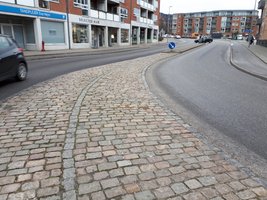 Vi må derfor ikke svinge til venstre, når vi kommer ud af porten. Gaden udfor er derfor lavet med et forhøjet helleanlæg så det ikke sker. Virker fint, ingen tvivl om hvordan der kan og skal køres, men efter det forhøjede helleanlæg fortsættes adskillelsen af de to modsatrettede kørebaner med et brostensbelagt areal i niveau med kørebanerne. Lysebrune granit chaussesten med en svagt mørkere ubrudt streg af samme stenformat i midten. For mig ligger det en arkitektingeniørmæssig "genistreg" - 🎀 flot og fin, men tæller det som var det en spærreflade i autoriseret hvidt?